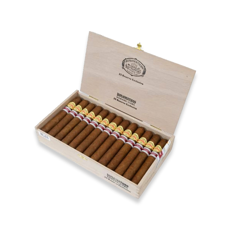With a length of 5 7/8 inches and a ring gauge of 54, the Diplomaticos Reserva Exclusiva is a size known as geniales in Cuban cigar factories. Only 2,400 boxes of these regional edition Diplomaticos were produced.